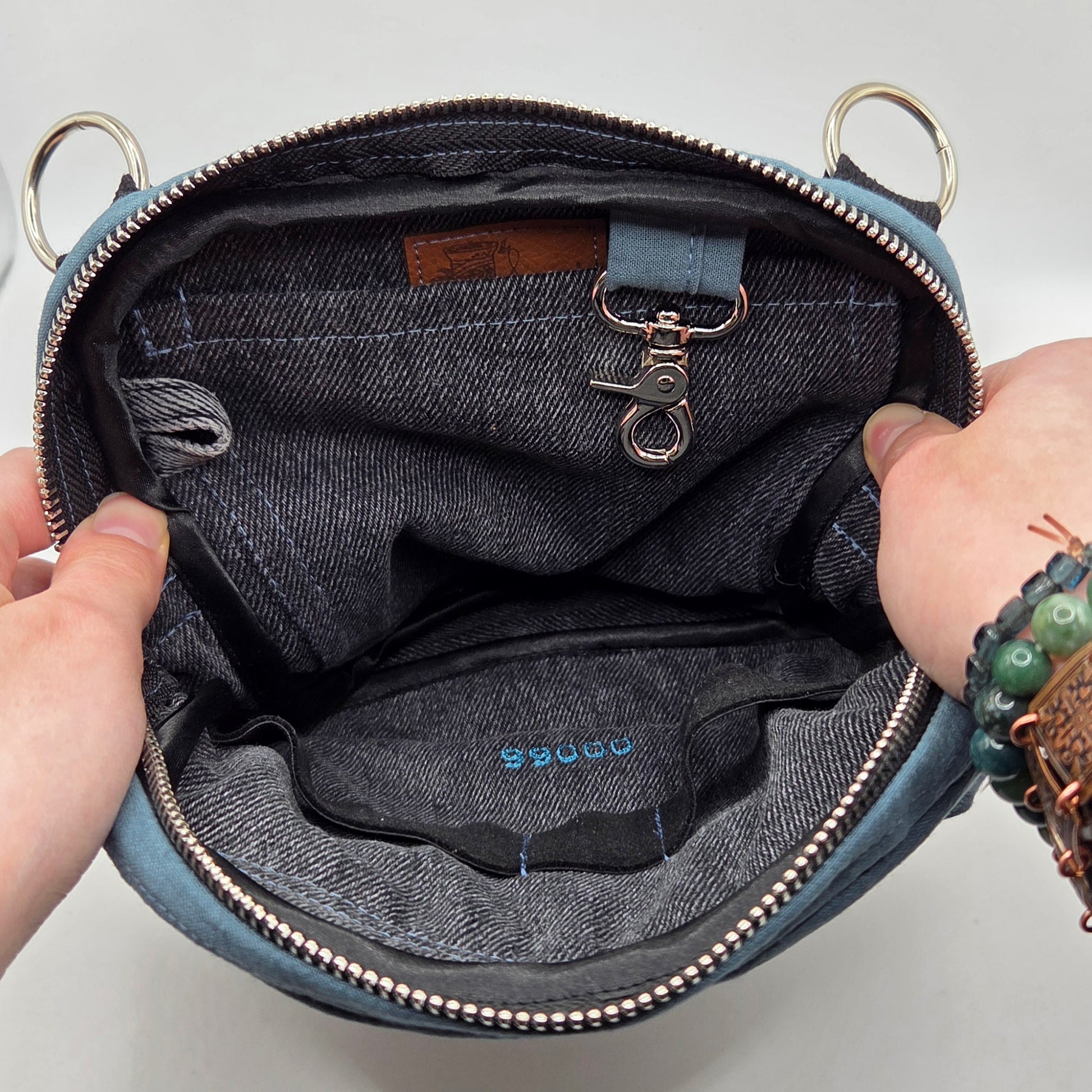 "Eloise" ist ein in Deutschland handgefertigtes Einzelstück, das sein früheres Leben teils als Tischdecke und teils als Jeanshose verbracht hat.